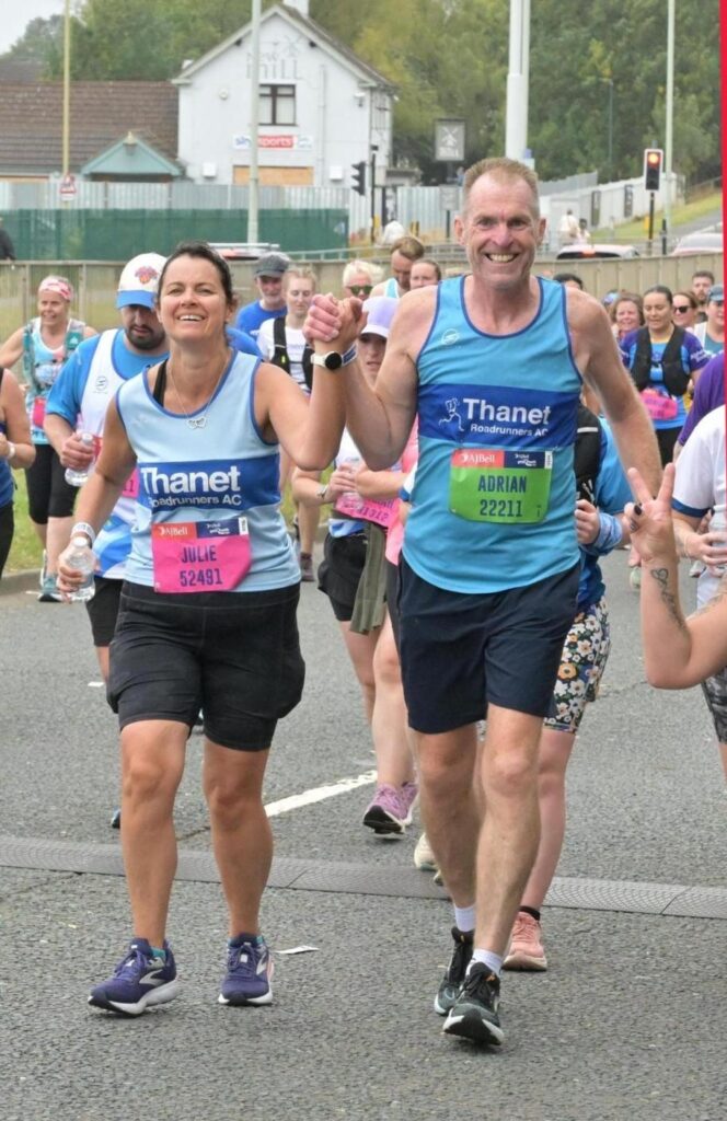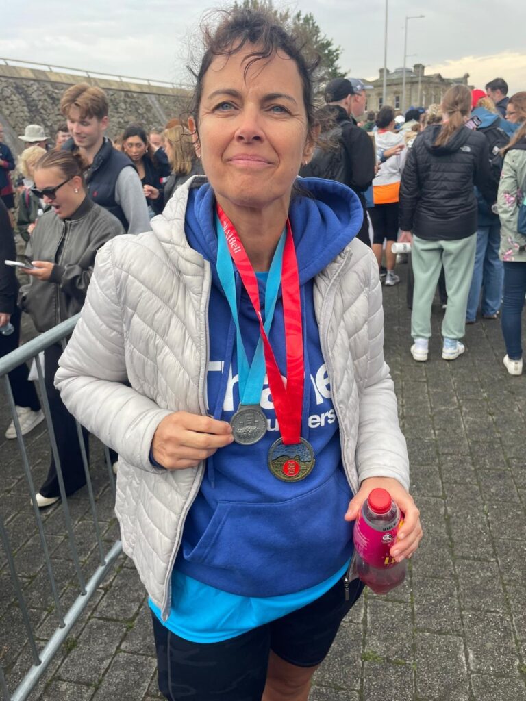 We could finally see the sea, Julie was so excited to be near the end, but the finish line was another mile and a half, I kept encouraging her all the way telling her how much her Dad would be proud of her, with grit and determination she made it to the end crossing the line hand in hand, she took her Dad’s medal from her Pocket and wore it with her own, had a few tears but really enjoyed the whole day.  She beat her dad’s time!!