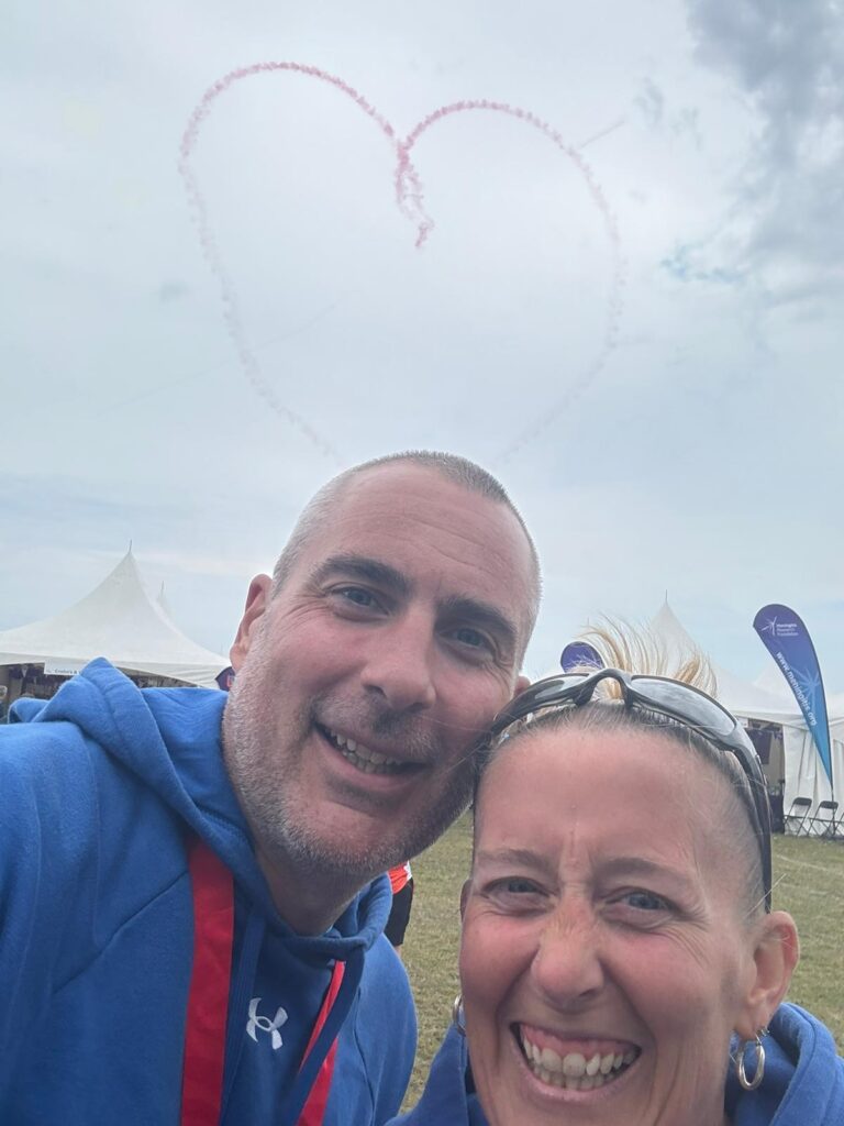 Last year this was the race I’d trained so hard for so this year I wanted to take it easier and try and spot friends who I’d missed last year! Just after halfway I spotted the Kiely’s (in-laws) who with the loud cheering they were doing would have been difficult to miss! That gave me a boost as we headed up yet another long incline!! The support all the way is second to none, you can even get a beer! Eventually finished and gathered up the goodies and bumped into Chris B and Liz, great to see them. We then watched the Red Arrows before heading off to our charity tents for a bit of TLC. It’s a great day!